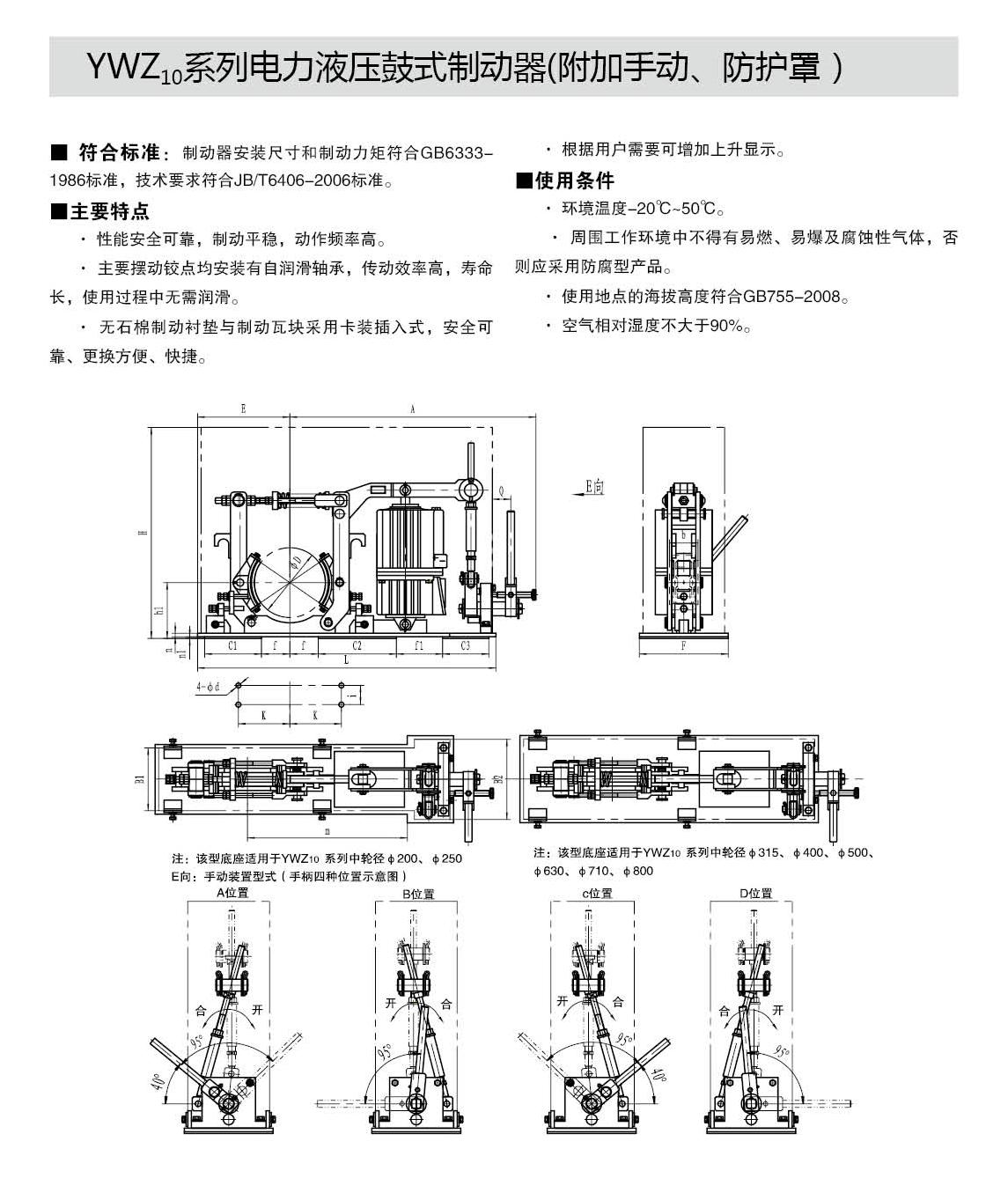 YWZ10,YWZ12系列電力液壓鼓式制動器的連接尺寸和制動力矩參數(shù)符合GB6333-86標準,技術要求符合JB / T6406-2006標準,配套符合DIN15430標準的Ed系列推動器。